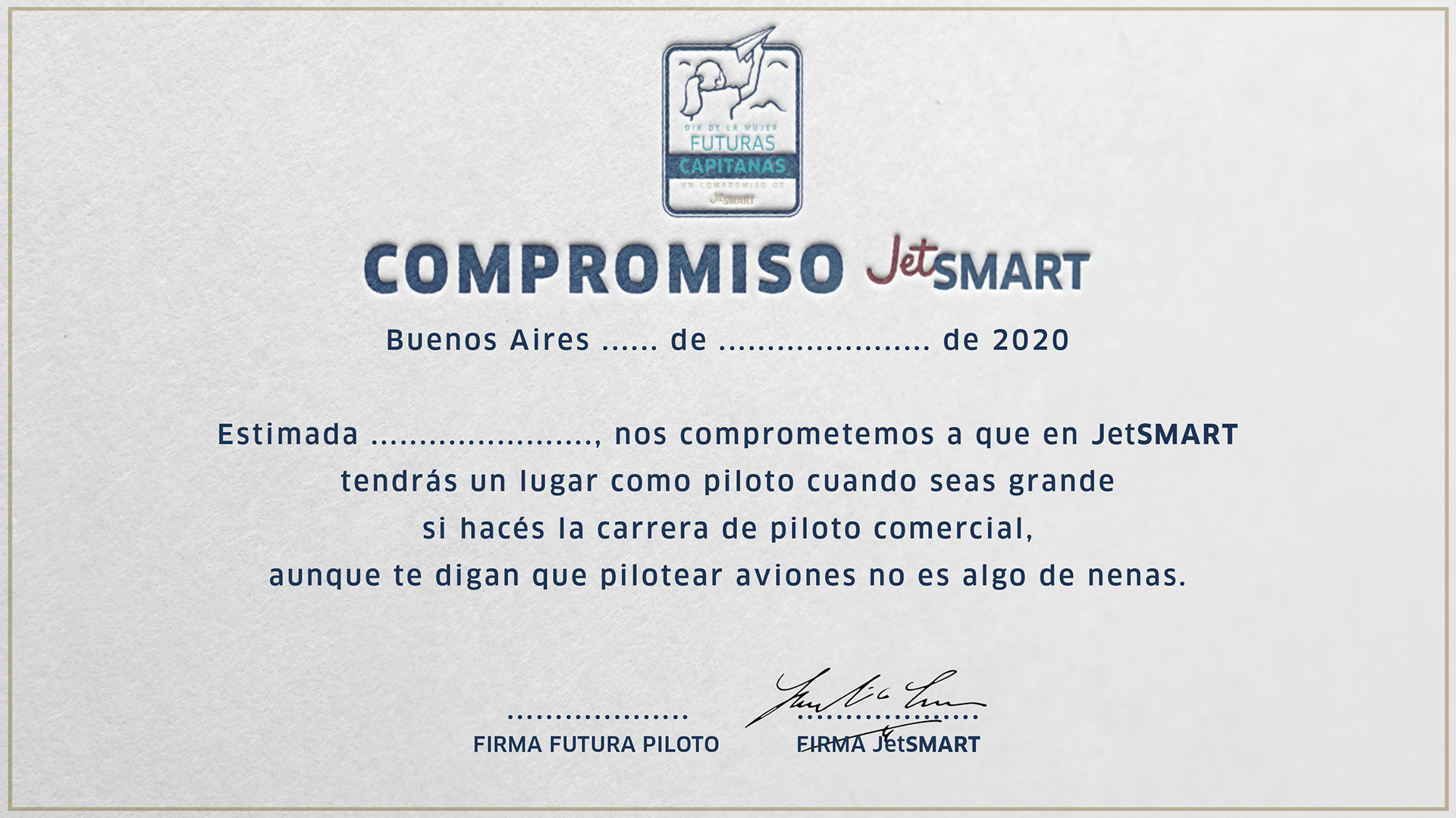 Como consecuencia de los roles de genero en Argentina el numero de mujeres pilotos es muy bajo, por eso en JetSMART decidimos atacar el problema desde la raíz, ofreciéndoles un trabajo como pilotos en el futuro a las más pequeñas que decidan estudiar la carrera de piloto comercial.